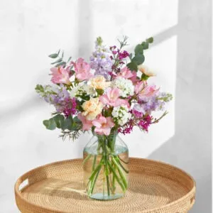 Descubre la elegancia en nuestro ramo floral exclusivo con delfinios, lisianthus, rosas, ruscus, dragonescitos y astromelias. Una combinación perfecta para regalar belleza y frescura. ¡Haz tu pedido y lleva esta exquisita armonía a tu hogar hoy!